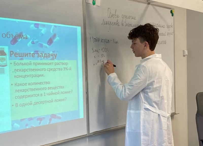 В рамках учебного предмета по выбору «Основы фармакологии» учащиеся 10 профильного медицинского класса под руководством учителя химии Морозовой В.В. знакомились с основами дозологии, применяли математические знания при расчете дозирования лекарственных препаратов, на практике отрабатывали методику приготовления растворов разной концентрации, решали расчетные задачи на содержание лекарственных веществ.